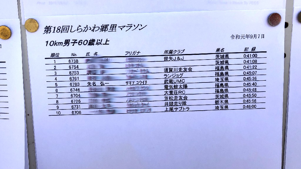 終わって結果を見てビックリ!なんと60歳以上クラス4位から10位までの記録が1分以内じゃないですか! ちょっと諦めたら10位以上になってしまうところでした。