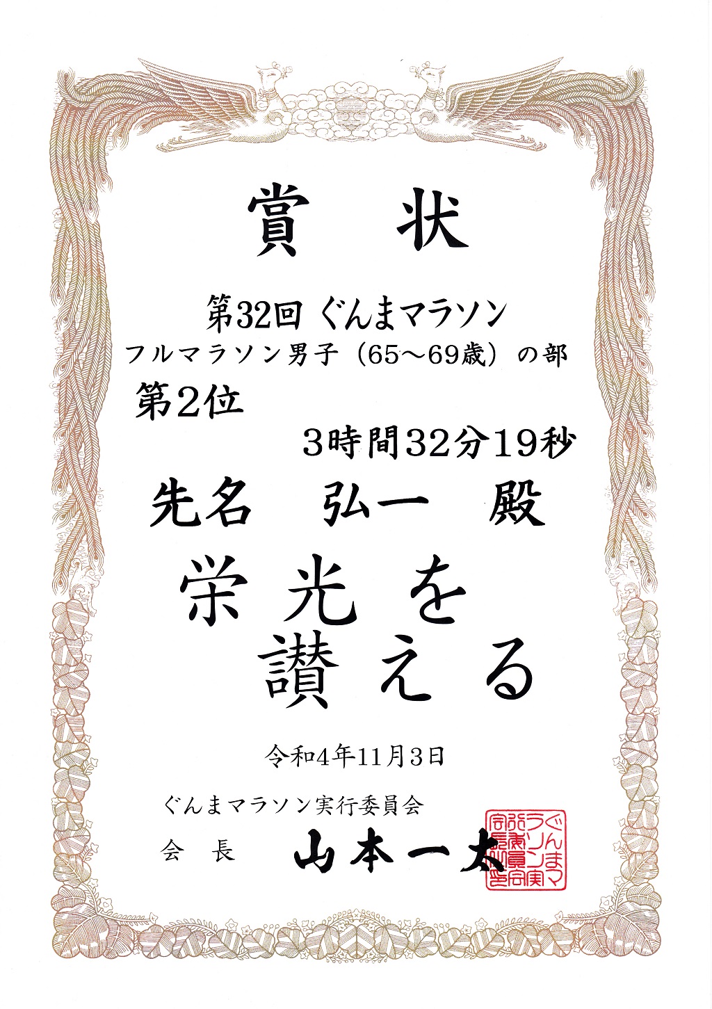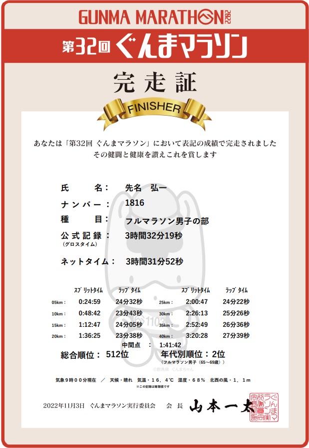 65歳〜69歳クラスで2位入賞!昨年は3時間29分59秒で5位だったのに、